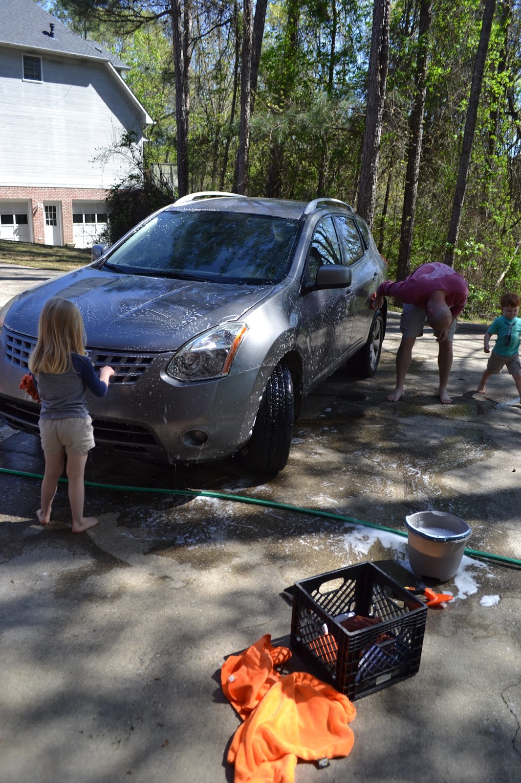 Daddy decided to wash Mommy's car and the kids decided to join in.